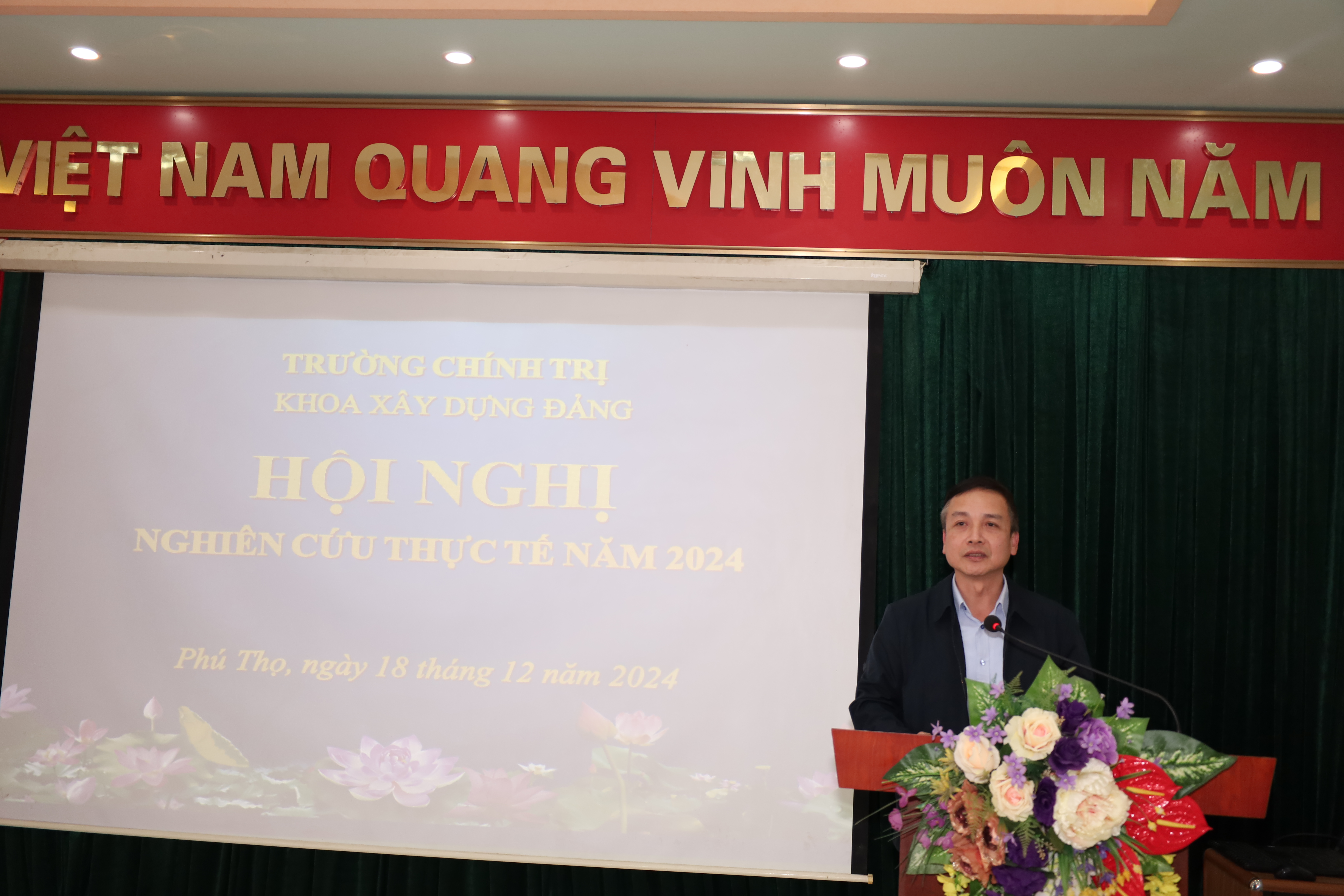 Phát biểu chỉ đạo tại hội nghị, TS. Đỗ Tùng - Hiệu trưởng nhà trường biểu dương tinh thần trách nhiệm, tích cực, gương mẫu đi đầu của 02 khoa Nhà nước và pháp luật và khoa Xây dựng Đảng trong việc tổng kết hoạt động nghiên cứu thực tế, ghi nhận những kết quả đã đạt được trong năm qua. Đồng thời, nhấn mạnh yêu cầu tiếp tục thực hiện tốt hơn hoạt động nghiên cứu thực tế của giảng viên trong năm 2025 với nhiều hình thức và hướng tới đạt hiệu quả, chất lượng cao hơn.
