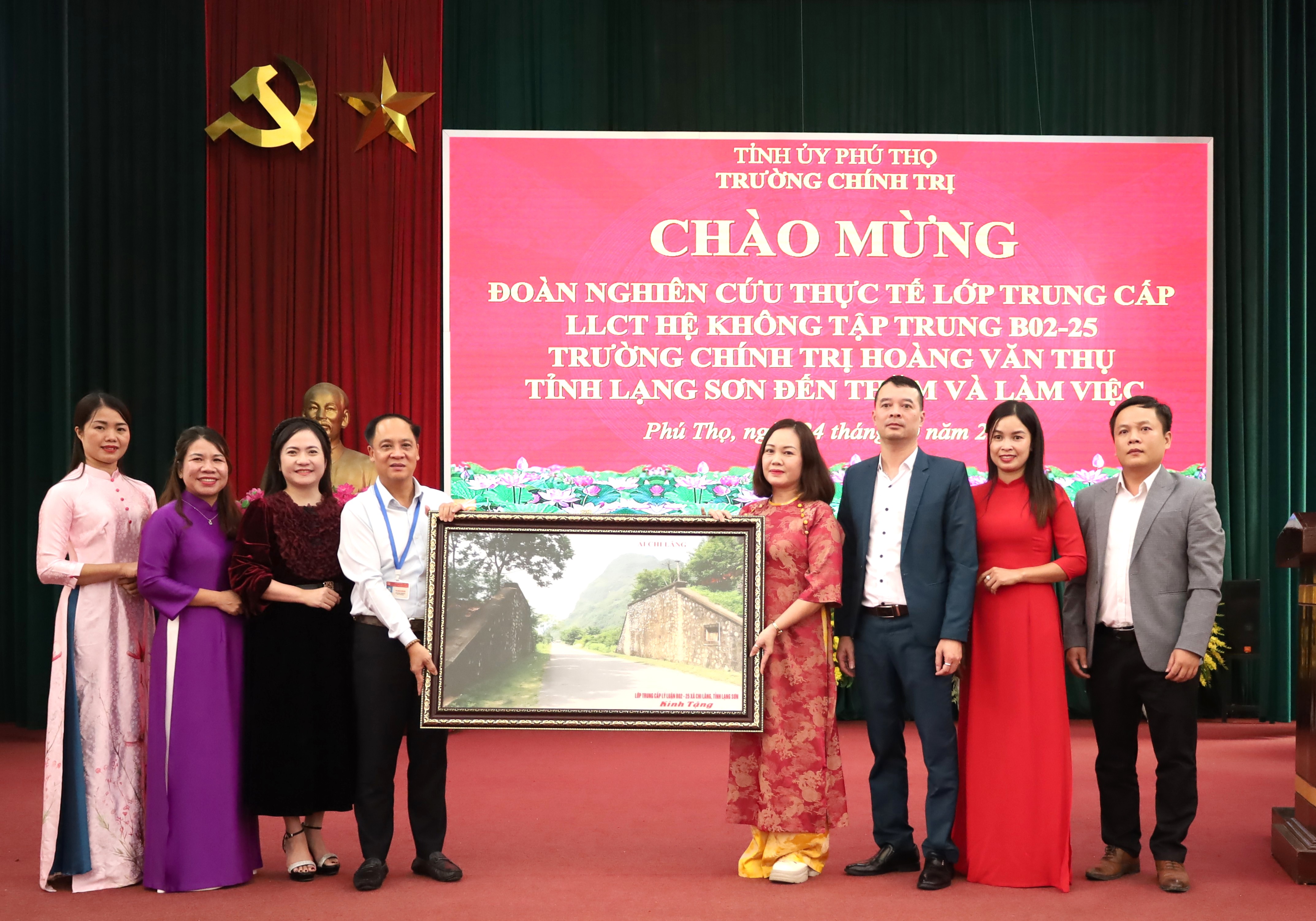 Dự buổi làm việc, về phía Trường Chính trị Hoàng Văn Thụ có đồng chí Vi Thị Thanh Tuyền - Phó Giám đốc Trung tâm Chính trị xã Chi Lăng, Trưởng đoàn; đồng chí Lương Thị Thu Huyền - Chủ nhiệm lớp, Phó Trưởng đoàn; cùng cán bộ, giảng viên và 63 học viên của lớp; Về phía Trường Chính trị tỉnh Phú Thọ có đồng chí ThS. Hoàng Tiến Điệp - Phó Hiệu trưởng, cùng đại diện lãnh đạo các khoa, phòng của Nhà trường.