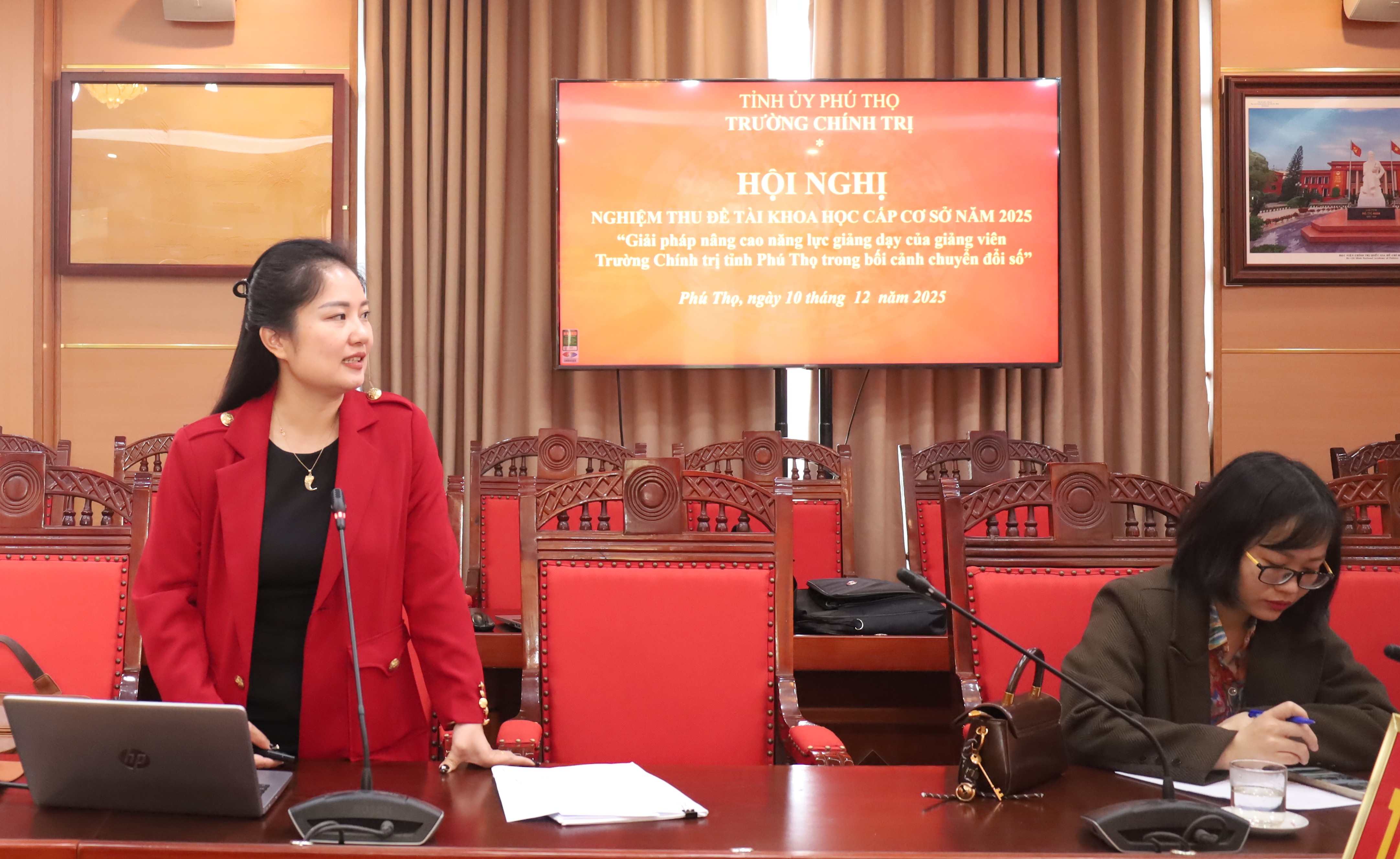 Trong báo cáo tóm tắt và phần trình bày trước Hội đồng, Chủ nhiệm đề tài nhấn mạnh: chuyển đổi số trong giáo dục cùng yêu cầu chuẩn hóa giảng viên theo Nghị quyết 71-NQ/TW đang tạo ra áp lực đổi mới mạnh mẽ đối với các trường chính trị. Thực tiễn tại Trường Chính trị tỉnh Phú Thọ cho thấy, bên cạnh tinh thần sẵn sàng đổi mới, đội ngũ giảng viên vẫn còn những khoảng trống về năng lực số, đặc biệt trong khai thác nền tảng học tập trực tuyến, công cụ tương tác, thiết kế bài giảng đa phương tiện và sử dụng hạ tầng kỹ thuật còn hạn chế. Trên cơ sở đó, đề tài đề xuất hệ thống giải pháp gồm: nâng cao nhận thức và tư duy số; bồi dưỡng kỹ năng số; đổi mới phương pháp dạy học lấy người học làm trung tâm; tăng cường ứng dụng nền tảng trực tuyến; cải thiện hạ tầng kỹ thuật và hoàn thiện cơ chế hỗ trợ, hướng tới xây dựng đội ngũ giảng viên đạt chuẩn năng lực số góp phần đưa Nhà trường trở thành đơn vị đáp ứng yêu cầu chuyển đổi số toàn diện trong thời gian tới.