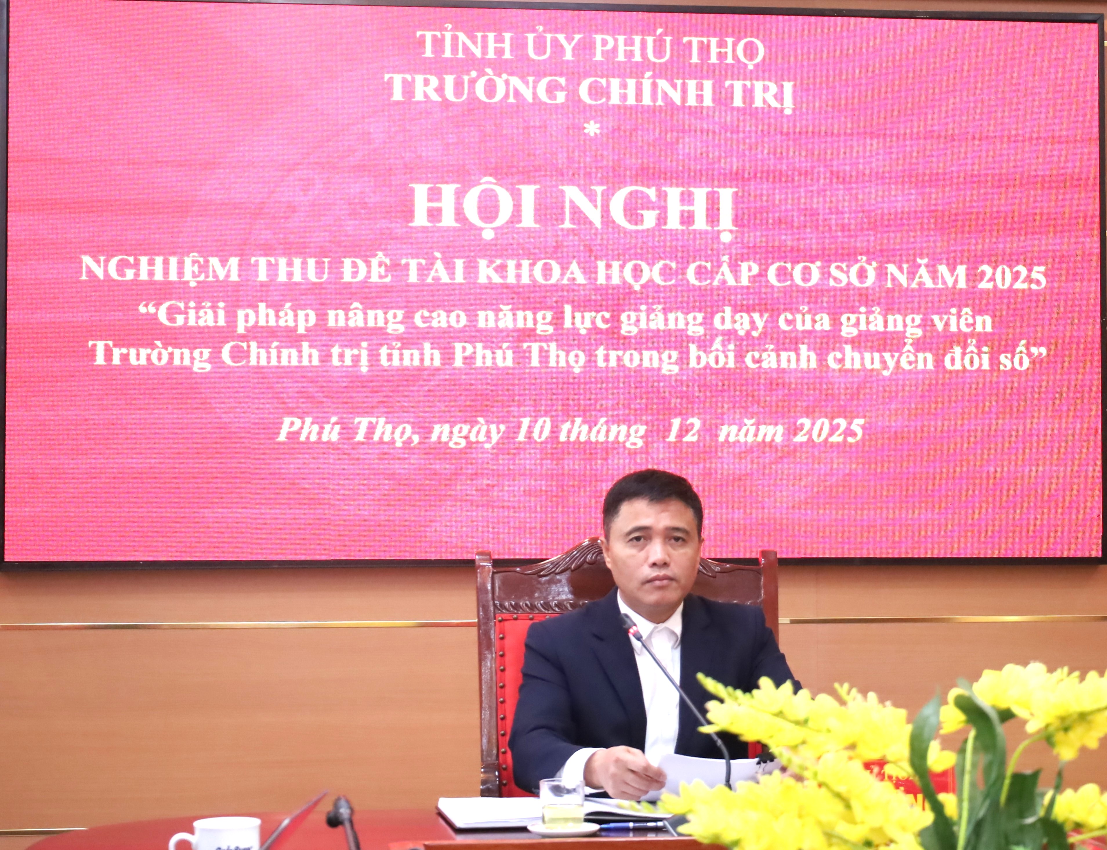 Phát biểu kết luận, Chủ tịch Hội đồng ThS. Nguyễn Hữu Đà ghi nhận và biểu dương tinh thần nghiêm túc, trách nhiệm của nhóm nghiên cứu. Đồng chí đề nghị đề tài cần tiếp tục làm rõ cơ sở lý luận về năng lực giảng dạy của giảng viên Trường Chính trị tỉnh, trong đó phân tích đầy đủ các yếu tố cấu thành năng lực gồm kiến thức, kỹ năng, thái độ và hành vi; đồng thời làm rõ yêu cầu mới về năng lực chuyển đổi số trong bối cảnh đào tạo, bồi dưỡng lý luận chính trị hiện nay.