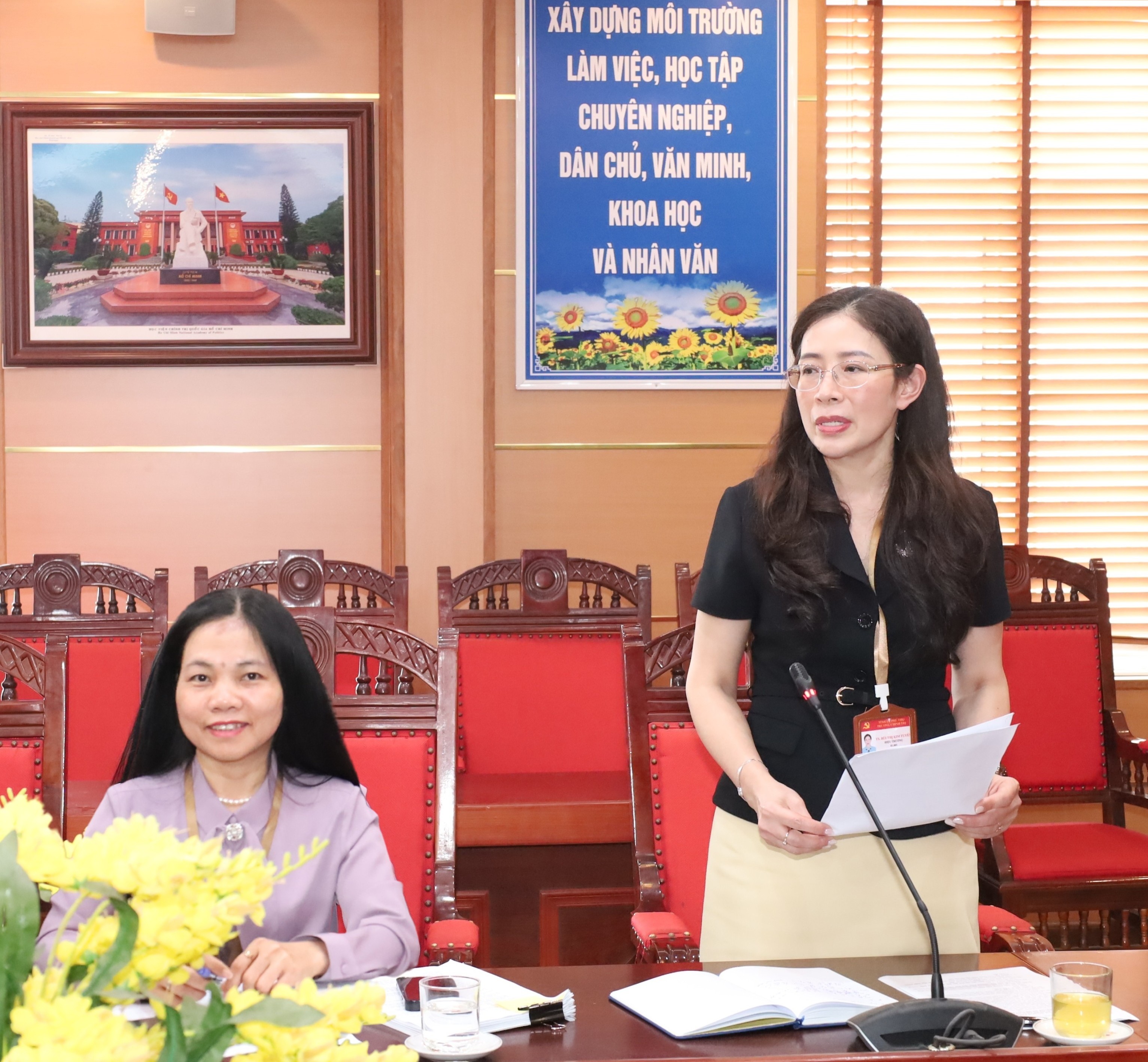 Đồng chí TS. Bùi Thị Kim Tuyến - Ủy viên Ban Chấp hành Đảng bộ tỉnh, Ủy viên Ban Chấp hành Đảng bộ các cơ quan Đảng tỉnh, Bí thư Đảng ủy, Hiệu trưởng phát biểu kết luận nội dung chương trình làm việc