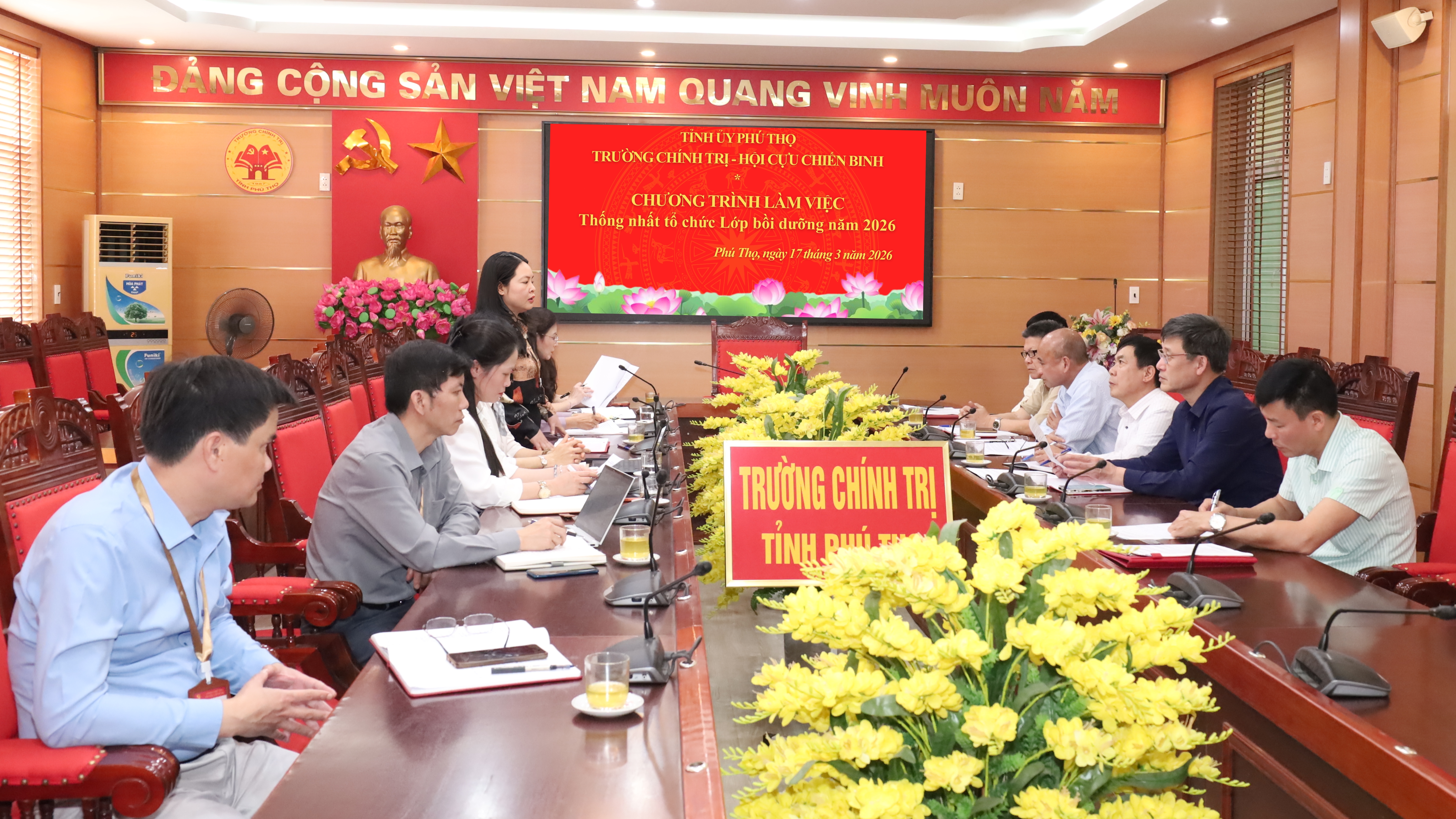 Chiều 17/3/2026, Trường Chính trị tỉnh và Hội Cựu chiến binh tỉnh tổ chức chương trình làm việc thống nhất phối hợp tổ chức lớp bồi dưỡng năm 2026. Tham dự chương trình, về phía Trường Chính trị tỉnh có đồng chí TS. Bùi Thị Kim Tuyến - Ủy viên Ban Chấp hành Đảng bộ tỉnh, Ủy viên Ban Chấp hành Đảng bộ các cơ quan Đảng tỉnh, Bí thư Đảng ủy, Hiệu trưởng, chủ trì buổi làm việc; cùng dự có đồng chí ThS. Hà Thị Thanh Hải - Đảng ủy viên, Phó Hiệu trưởng; lãnh đạo các khoa, phòng của Trường. Về phía Hội Cựu chiến binh tỉnh có đồng chí Thiếu tướng Trần Anh Du - Ủy viên Ban Thường vụ Trung ương Hội Cựu chiến binh Việt Nam, Phó Chủ tịch Ủy ban Mặt trận Tổ quốc Việt Nam tỉnh, Chủ tịch Hội Cựu chiến binh tỉnh; cùng các đồng chí lãnh đạo, chuyên viên Ban Công tác Cựu chiến binh.